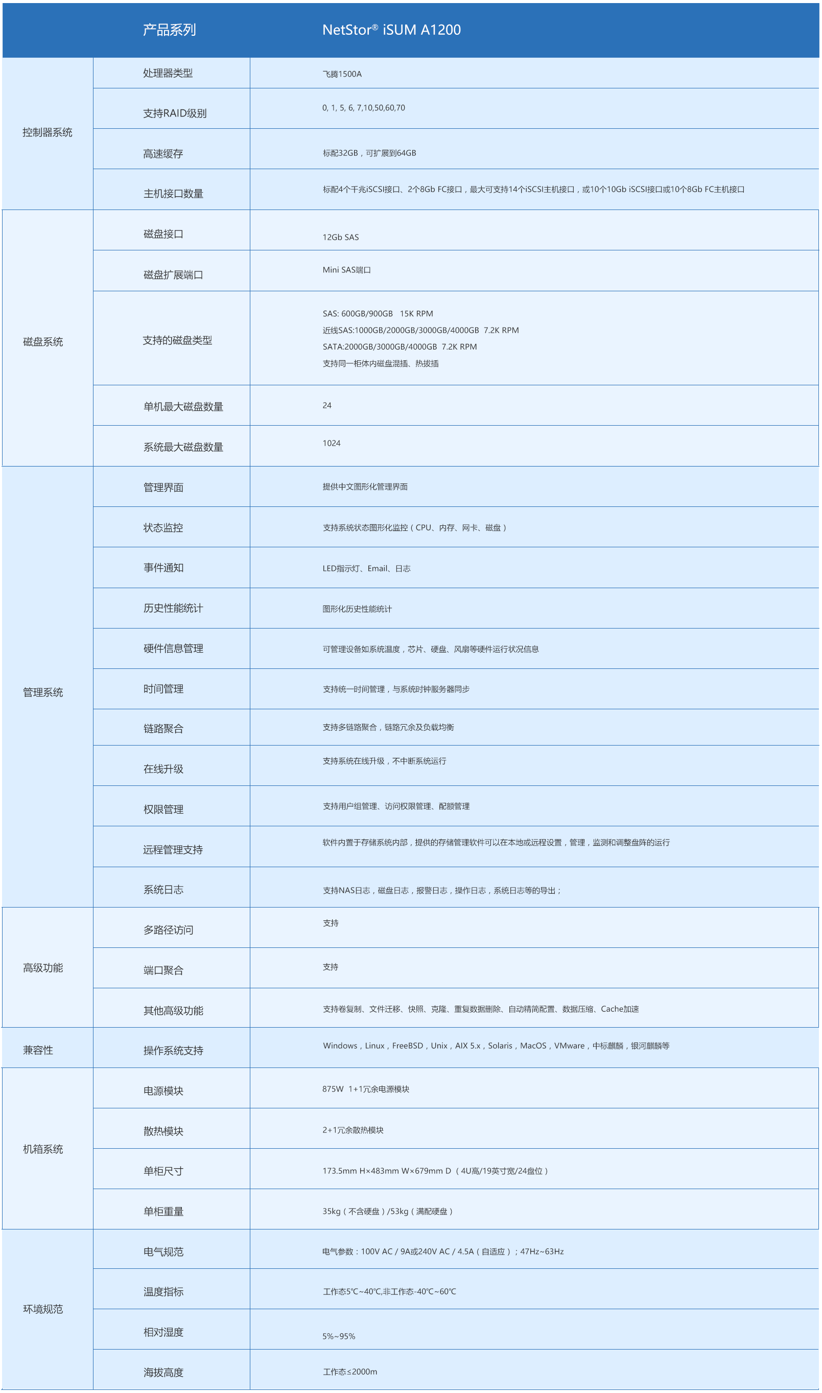 iSUM A1200是国产自主创新的统一存储产品,其结构简单、容量大的特点,可在党、政等有安全自主要求的文件存储业务中发挥作用,还可以在数据备份业务中展现国产自主创新存储的实力,安全可靠,稳定无忧。