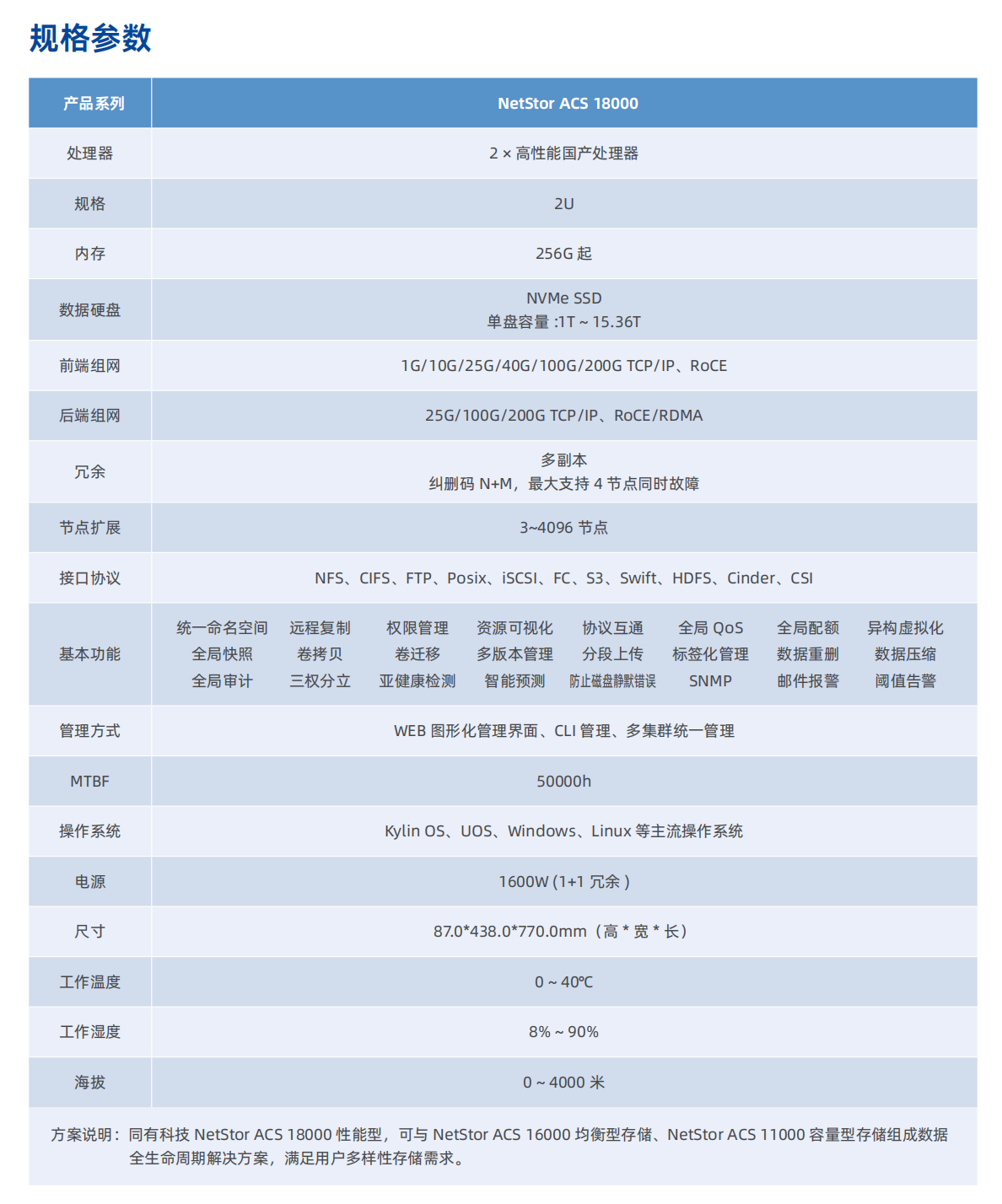 NetStor ACS 18000是基于PCle 5.0的自主可控全闪分布式高端存储产品,在存内计算、系统总线、软件架构、网络协议等方面全面升级,实现了性能代际跨越增长。完全满足AI、大模型、HPC、大数据分析等之前只能靠国外高端产品才能满足的超高性能的核心业务应用需求,彻底解决了长久以来困扰用户的国产存储性能掣肘难题。